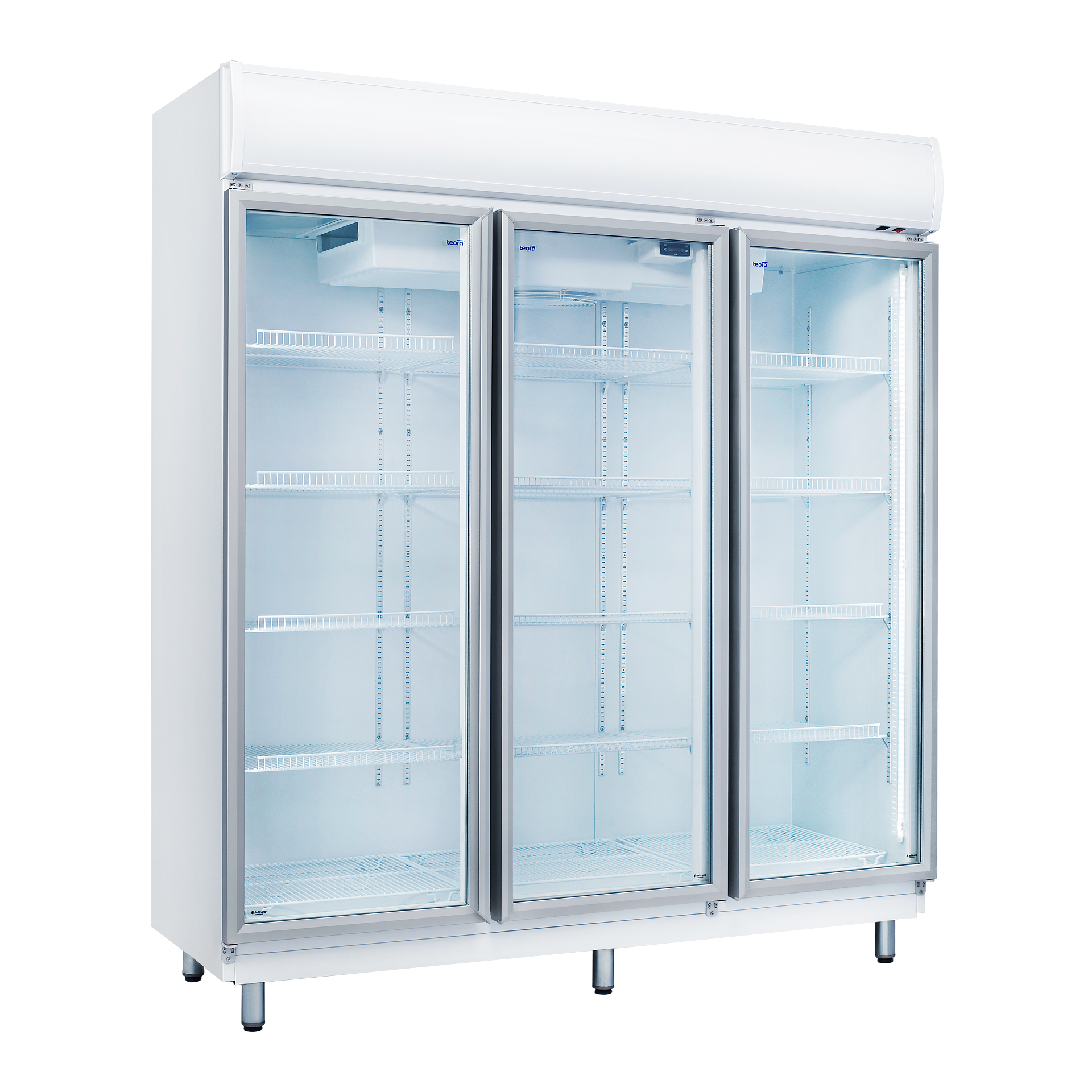 Heladera exhibidora vertical 3 puertas capacidad 1350 lts. Puertas de vidrio termopanel. Iluminación Led. Estantes regulables. Sistema de frío forzado que garantiza excelente calidad de frío para botellas, latas, y todo producto envasado.